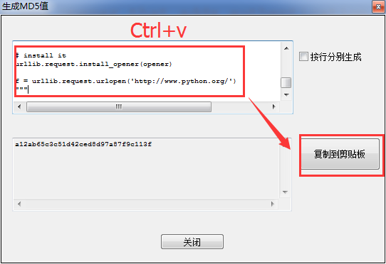4、然后將數據ctrl+v,粘貼到白色空白區域,如圖,軟件即可自動生成MD5值,然后點擊“復制到剪切板”,即可復制出來了。