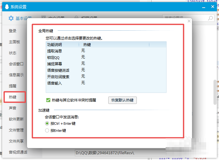 3、qq的快捷鍵也可以在設置-熱鍵中找到,不用的也可以取消勾選。它還有貼心的沖突提醒功能。