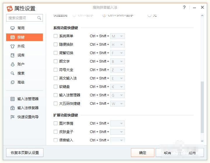 2、輸入法的快捷鍵在它的設置列表-按鍵中找,用不到的話全部取消勾選。