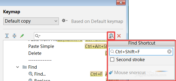3、右邊的小放大鏡點擊后打開的小窗可以按按鍵組合搜索,比如按下ctrl+shift+f,可以搜索ctrl+shift+f是什么功能