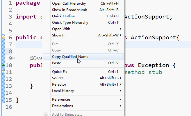 1、如果你是在類外部點擊右鍵,然后選擇Copy Qualified name,它的結果是帶有斜線的路徑。例如:/shop1/src/gxqbc/shop/index/IndexAction.java