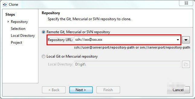 2、然后彈出對話框,先填寫Repository URL。然后Next。