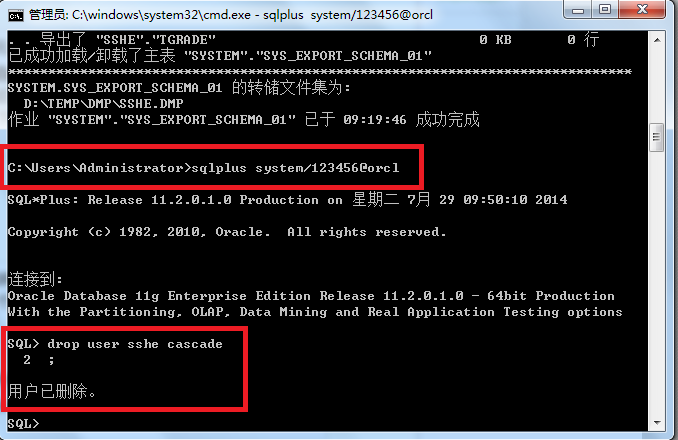 然后,刪除目標(biāo)數(shù)據(jù)庫用戶 drop user sshe cascade;