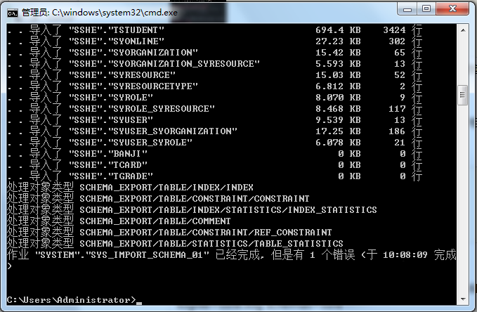 輸入導(dǎo)入命令:impdp system/123456@orcl directory=dpdata1 dumpfile=SSHE.DMP logfile=sshe.log schemas=sshe