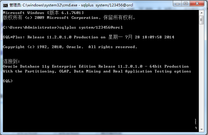 首先,再一次登錄數(shù)據(jù)庫 sqlplus system/123456@orcl