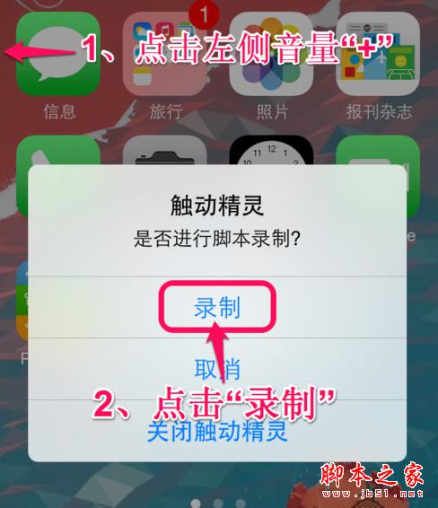 1、首先我們要運(yùn)行觸動(dòng)精靈工具,然后回到主菜單,只要點(diǎn)擊設(shè)備的【音量+】鍵,就可以彈出一個(gè)菜單,再次點(diǎn)擊【錄制】就會(huì)開始錄制腳本了;