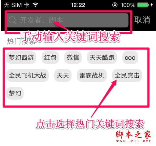 點擊搜索按鈕后進(jìn)入如下界面,點擊熱門關(guān)鍵詞搜索或手動輸入搜索,即可進(jìn)入下載頁面。