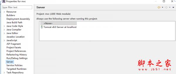(2)在項(xiàng)目上右鍵Properties 選擇Server 發(fā)現(xiàn)當(dāng)前選擇的服務(wù)器為<None>,選擇下面的Tomcat v8.0 Server at localhost