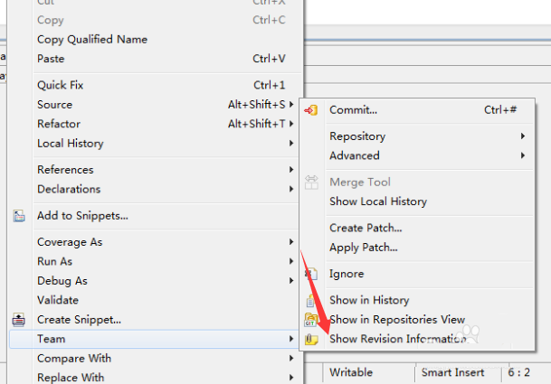 3、選中為了team的選項之后,在下一級菜單中進行選擇為show revision information的選項。