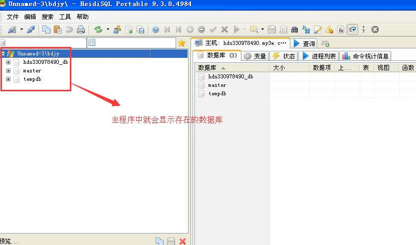 3、如果信息正確,就可以顯示如下圖的數據庫名稱(紅框中);點擊打開就可以進入主程序中