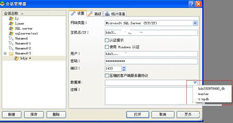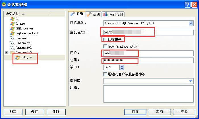 2、新建一個會話管理器,重新命名為bdjy;設置網絡類型Microsoft SQL Server(TCP/IP);輸入可用的sql server的地址和用戶名密碼;