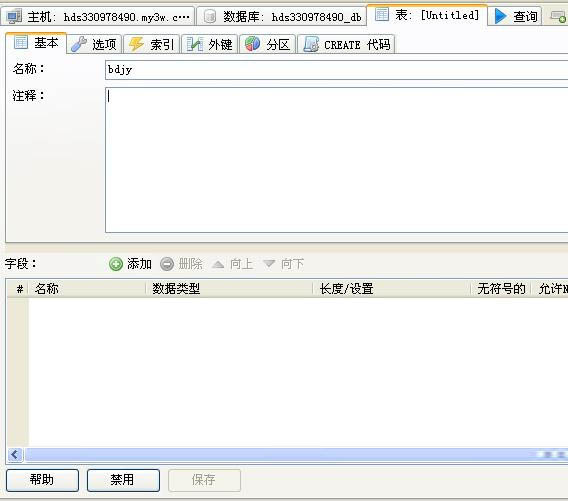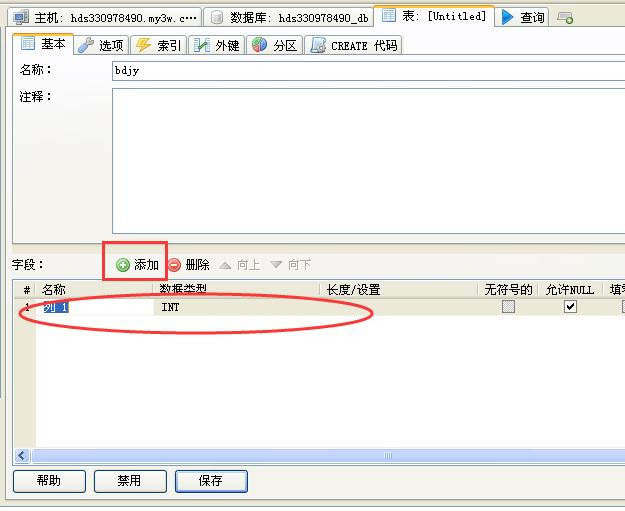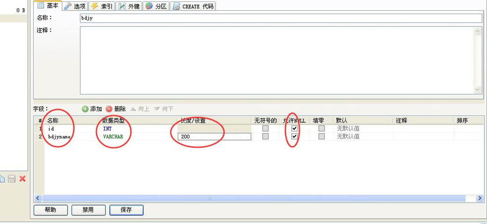 5、表創建好了,接下了就是給表添加字段;點擊“添加”后下面就會新建一行;可以對字段個各種設置;此處添加兩個字段一個id和bdjyname;單擊“保存”創建成功,可以在代碼去看到sql代碼