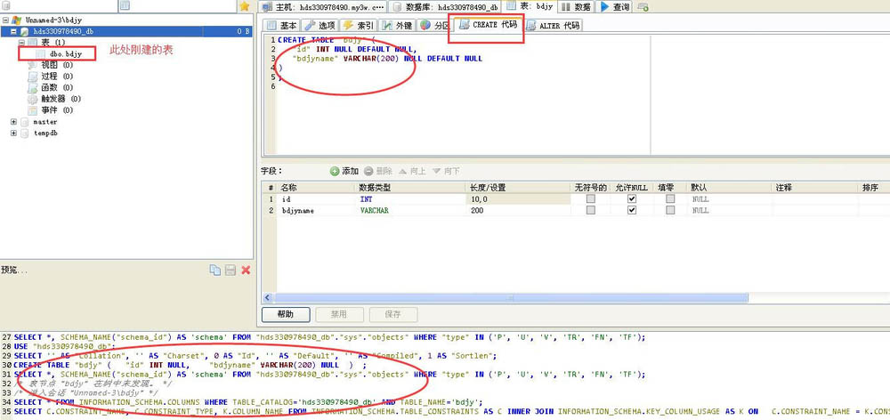 4、創建新的表:點開要操作的數據下拉信息,選擇表右鍵點擊創建新的表下的表“bdjy”;會自動生成建表的代碼