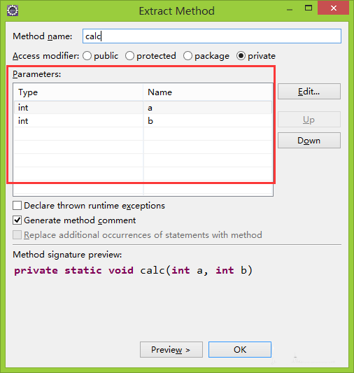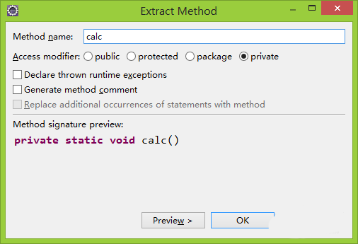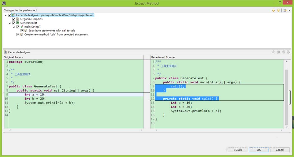 4、預覽沒有問題,點擊Back返回,然后點擊Ok就可以抽取封裝方法了。Eclipse為我們生成的抽取方法代碼,記得自己核對下看看是否符合我們的需要