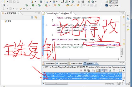 3:運行MyEclipse軟件創(chuàng)建一個項目,在項目里面建立一個CreatePluginsConfig類,把上面的代碼復(fù)制進去,記得修改你的插件路徑。