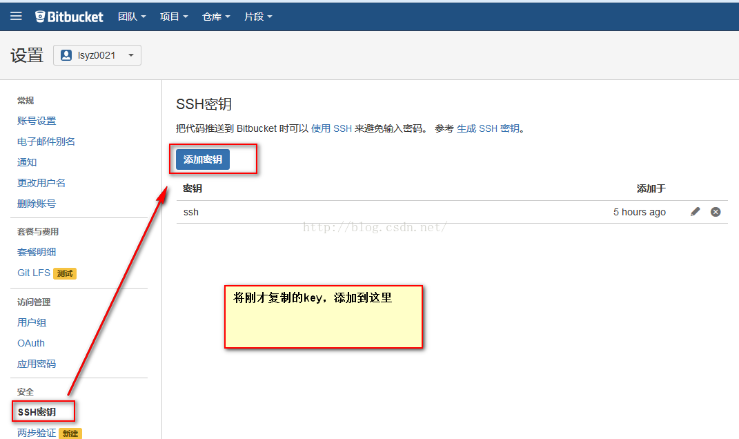 這是bitbucket的添加key,點擊右上方的頭像,選擇設置,然后