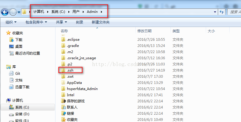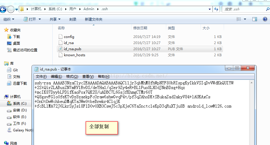 6、打開Admin目錄進入.ssh文件夾,用記事本打開id_rsa.pub,復制里面的內容添加到你github或者bitbucket ssh設置里即可