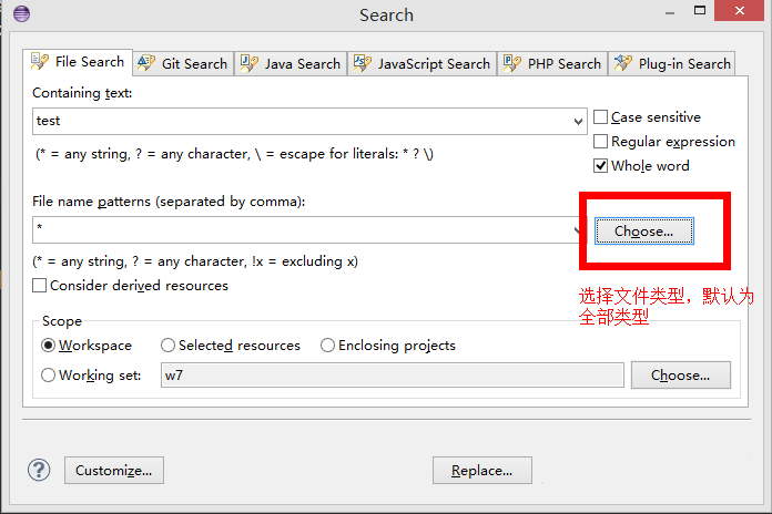 3、在Containing text下邊的輸入框內(nèi)輸入你要搜索的內(nèi)容,文件類(lèi)型默認(rèn)為*(指全部類(lèi)型文件),也可以點(diǎn)擊右邊的choose自定義類(lèi)型。