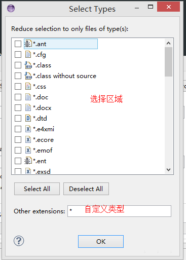 4、如圖所示,自定義文件類(lèi)型界面,在需要的類(lèi)型前面打勾,如果上面的列表中沒(méi)有你想要的類(lèi)型,可以在下邊的other extensions輸入框內(nèi)輸入自定義類(lèi)型,如:.pdf,完了點(diǎn)OK;