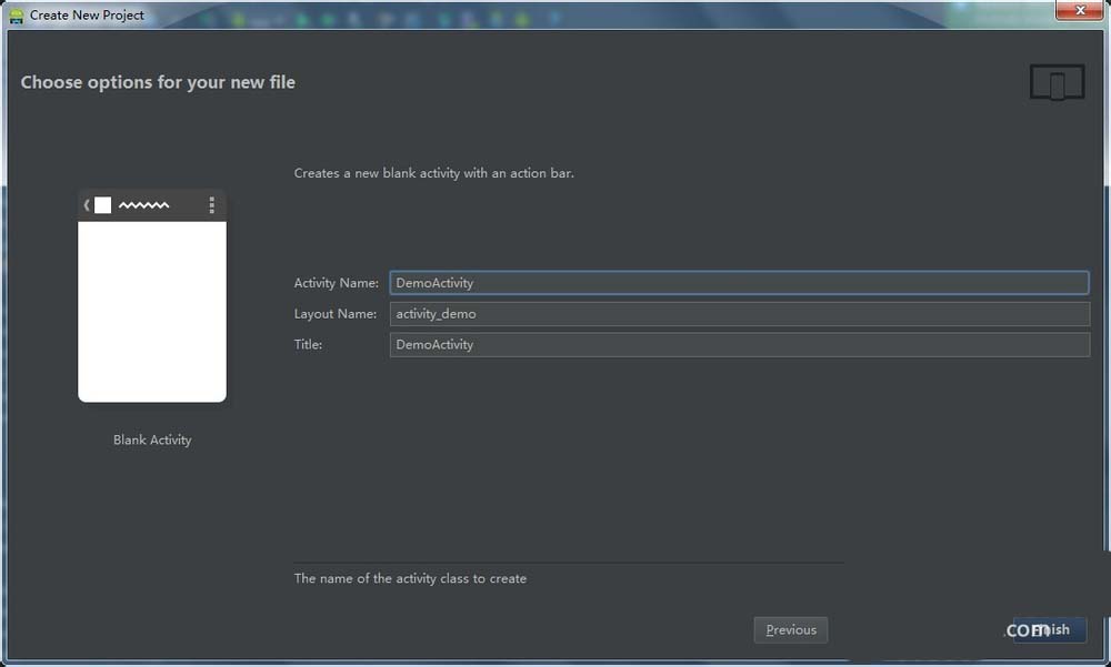 6、接下來設(shè)定活動名稱,界面布局的名稱,以及界面標題,最后點擊finish完成項目的創(chuàng)建。