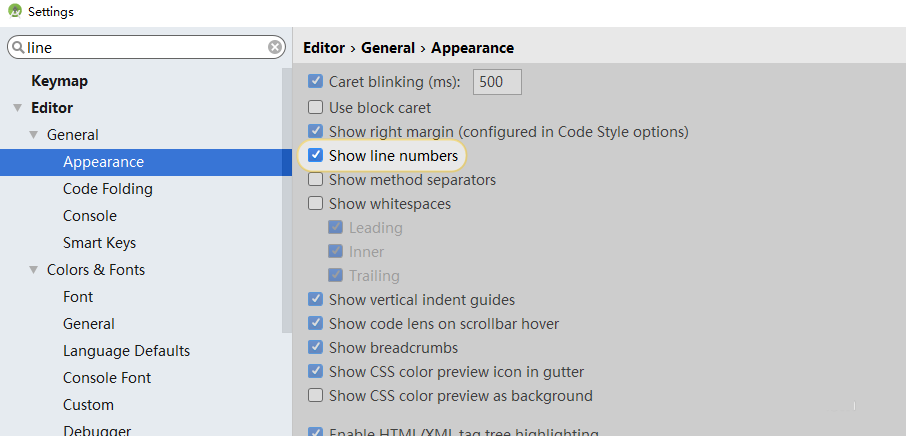 3、在設置頁面左上方的輸入框中輸入“line”,按回車鍵搜索。然后選擇Editor→General→Appearance,選中右邊的Show line numbers