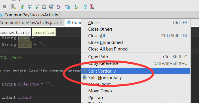 2、此時會彈出菜單彈窗,選擇Split Vertically ,即可實現左右比較兩個文件;選擇Split Horizontally,即可實現上下比較兩個文件。