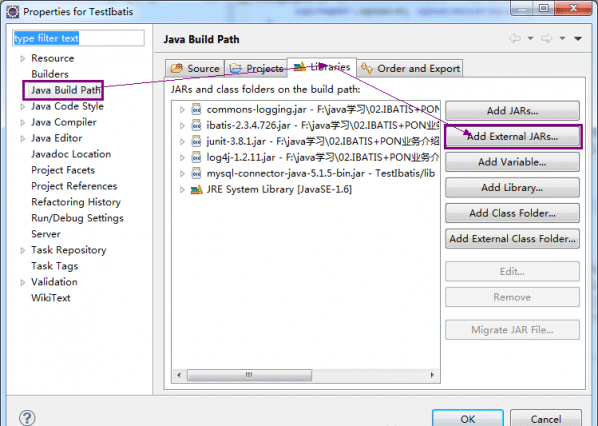 右擊“項目”→選擇Properties,在彈出的對話框左側列表中選擇Java Build Path,如下圖所示:選擇Add External JARs,就可以逐個(也可以選擇多個jar,但是限制在同一個文件夾中)添加第三方引用jar包。