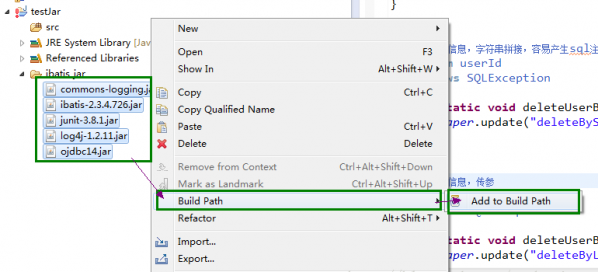 選中需要添加到項目中的jar包,右鍵選擇"Build PathàAdd to Build Path",這樣Jar包就成功導入到項目中了。