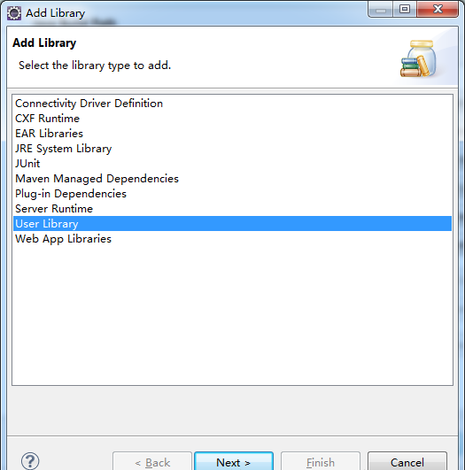 右擊“項目”→選擇Properties,在彈出的對話框左側列表中選擇Java Build Path,彈出如上圖所示的對話框,這里選擇"Add Library",彈出如下圖所示對話框,選擇"User Library",然后選擇→Next
