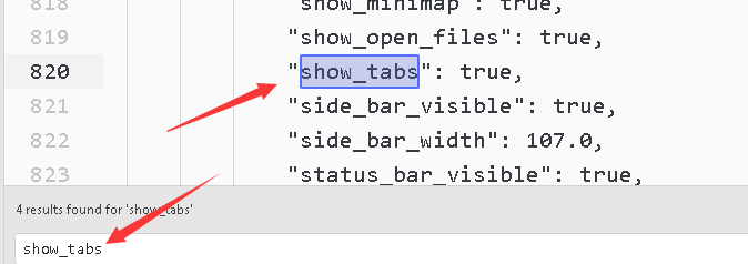 3、然后使用編輯器 打開這個文件 ,在文件中搜索show_tabs將所有的show_tabs 對應的false改為true (所有的 一共有四個 都要做更改) ,然后保存退出,重新開sublime,就會顯示標簽頁了。