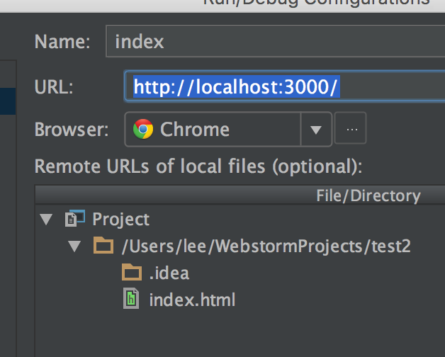 五、其它說明大部分項目都不是利用WebStorm內置的WebServer運行項目的,比如更多的是使用Tomcat、browser-sync這類工具,因為API部分需要訪問server-end,但也沒有問題,假如你的項目啟動后,訪問地址為:localhost:3000,那么你在添加Debug的界面就要改成如下: