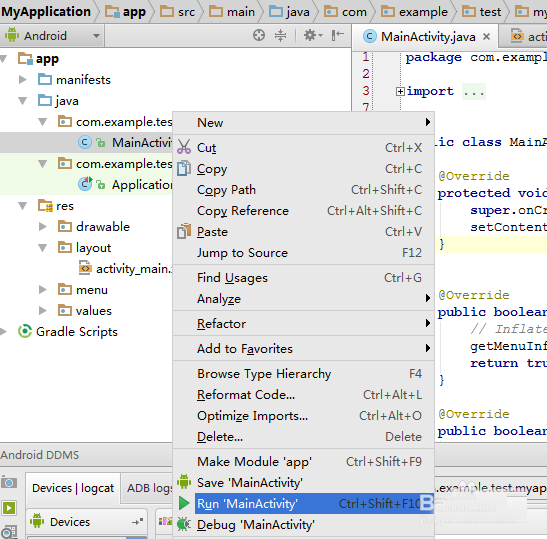 4、在MainActivity上點(diǎn)擊右鍵->"Run 'MainActivity'"。