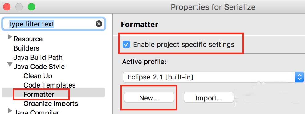 3、啟用自定義的自動化排版樣式。點擊左側選擇欄的"Java Code Style(Java代碼風格)"->"Formatter(排版)",看到右側的頁面。然后,勾選"Enable Project Specific Settings(啟用工程配置)"選項,再點擊"new(新建)"按鈕,來設置自定義的代碼風格。