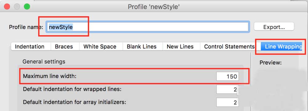 5、設置行寬的最大值。點擊右上角附近的"Line Wrapping(行截斷)"標簽頁,在"General Settings(通用設置)"下設置"Maximum line width(最大行寬)"的值,從默認值80改成150,保存設置。