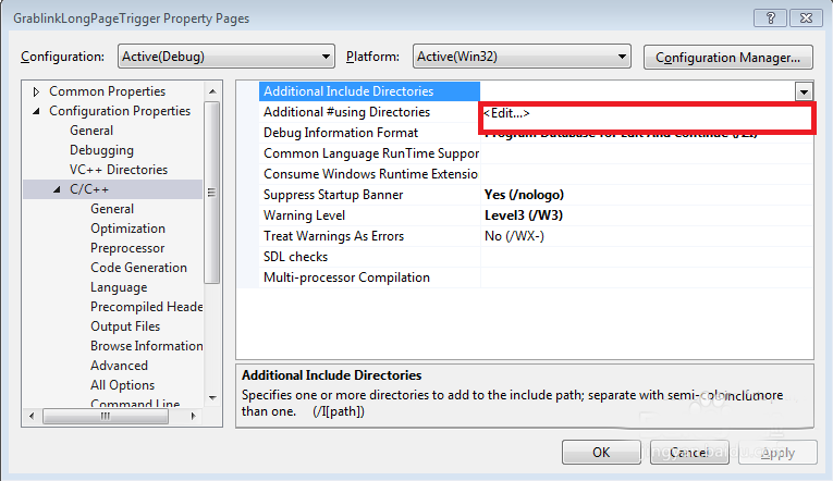 3、在屬性設(shè)置框中打開以下目錄Configuration Properties-C/C++-Additional Include Directories