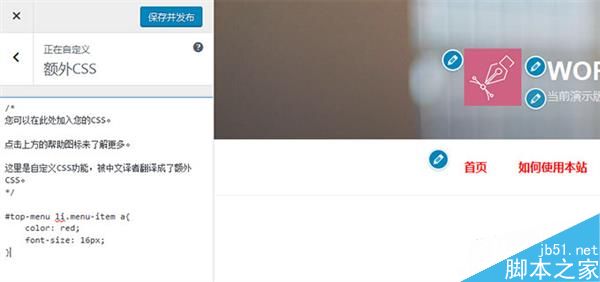 在WP 4.7的后臺,這個功能叫做Additional CSS,所以上圖中譯作額外CSS。我們添加了幾行代碼,就可以改變菜單的字體和顏色。所有的改動可以在右側(cè)直接看到;修改滿意之后,再發(fā)布到網(wǎng)站前臺。