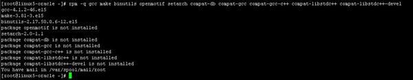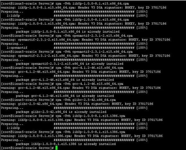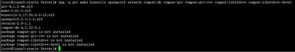 然后再檢查所需安裝包是否全部安裝成功:rpm -q gcc make binutils openmotif setarch compat-db compat-gcc compat-gcc-c++ compat-libstdc++ compat-libstdc++-devel