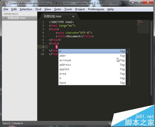 用sublime text代碼編輯器簡單方便,對于如何快速的生成一個html文檔的頭部,一些人有可能會遇到和小編一樣的問題,按住Tab鍵根本沒反應(yīng),其實是一些步驟性的錯誤,下面我們一起來做一遍。
