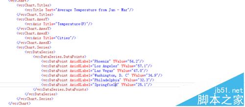 6、然后我們就可以直接引用這個chart庫去建立chart所需要的一些屬性,當然,如果沒有關了什么重要的東西,可以直接在前臺代碼直接完成,主要包括chart橫縱坐標集,標題,以及數據集。