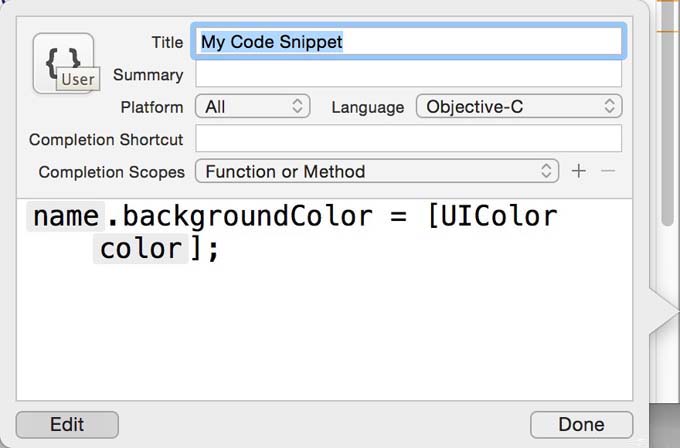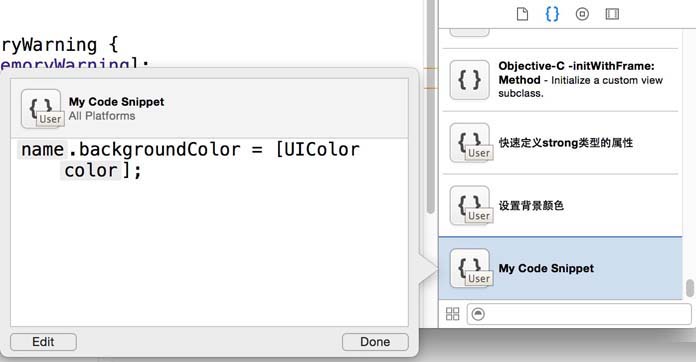 “Title”是這個代碼塊的標題,可以簡單寫幾個字,比如“設置背景顏色”;“Summary”是一個概括描述,可以不填;“Platform”中設置此代碼塊的作用的平臺(All/iOS/OS X/watchOS);“Language”是對應的語言,有很多中可以選擇;“Completion Shortcut”是此段代碼塊的快捷代碼,在編寫代碼時只要打出快捷代碼就可以直接使用這個代碼塊,比如設置背景顏色的代碼可以填寫“bgcolor”;“Completion Scopes”是該代碼塊的生效區域,可以默認。填寫完畢后點擊“Done”即可。