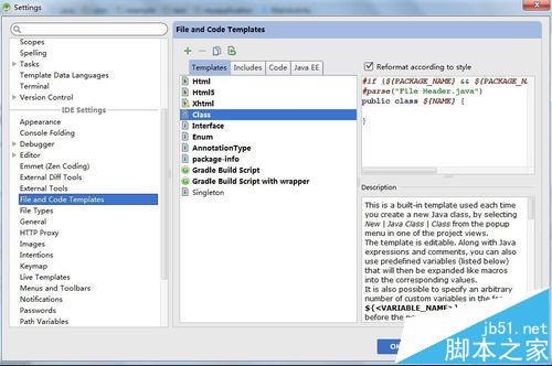 2、點擊“IDE Settings”下面的“File and Code Templates”,然后選中Templates里面的Class。