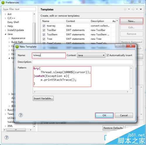 3、然后在有面窗口中,點擊“New”,彈出“New Template”對話框,在里面我們可以設置自定義的代碼模板的名字以及代碼的具體內容。比如:我定義了一個叫做tsleep的模板,當輸入tsleep,并按下alt+/的時候,編輯器會自動替換成: