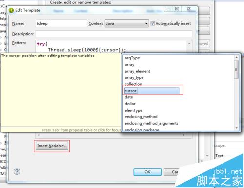 4、注意上圖中輸入的${cursor},這是通過點擊“Insert Variable...“插入光標。還有更多的選項,可以自己嘗試下。