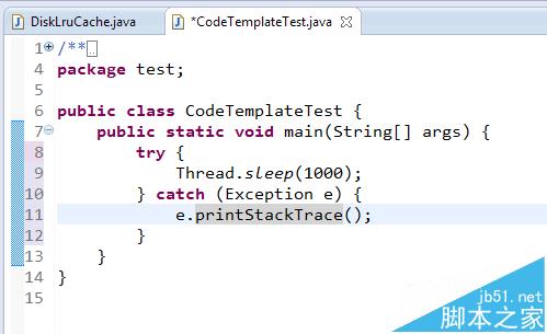 5、在Eclispe中新建一個Java源文件,然后輸入tsleep,編輯器會自動替換成: