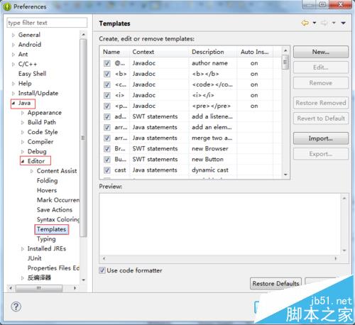 2、在Preferences”對話框中點擊“Java”->“Editor”->“Templates”。