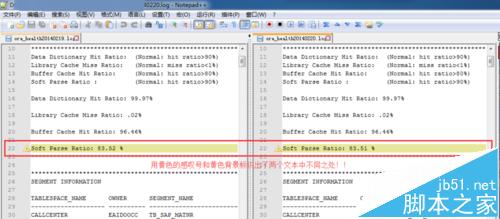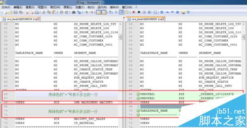 6、這時,整個Notepad++的布局發生了變化,形成了一種左右對比的布局,并且有些行還有不同的背景顏色和小圖標,這些都代表著兩個文本內容的不同之處,黃色"!"嘆號表示有部分內容不同,綠色“+”號表示多出來的行,紅色”-“表示少出來的行,如圖所示: