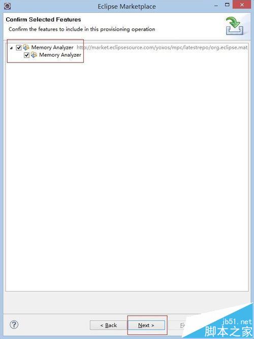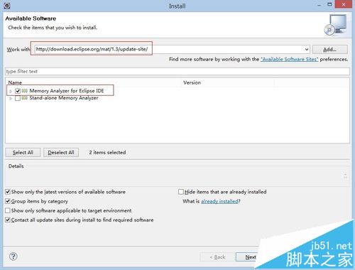 2、在work with輸入圖中下載地址,勾選Memory Analyzer for Eclipse IDE選項