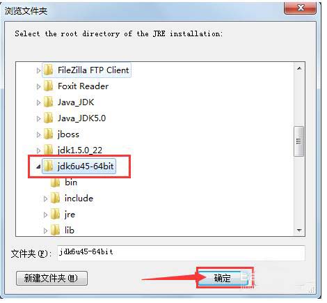 4、在瀏覽文件夾窗口中,找到jdk1.6所在目錄,選中它,然后點擊 確定。小編這里的文件夾的名字是jdk6u45-64bit