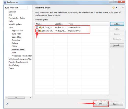 6、可以發(fā)現(xiàn),此時在Preferences窗口中,多了一個我們新添加的jdk6,點擊它前面的小方格,最后點擊 OK 按鈕,至此,我們已經(jīng)完成了添加并更換JRE的步驟。