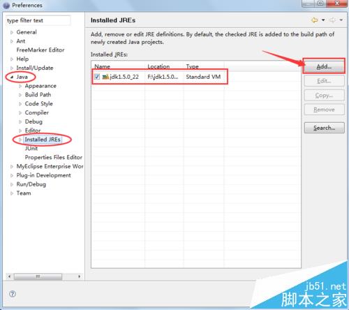 2、在Preferences窗口中,點開Java的下拉列表,找到并選中 Installed JREs,并點擊右邊的 Add... 按鈕。如圖,從圖中可以看出,小編電腦上已經(jīng)裝了jdk1.5,下面我們將繼續(xù)添加并更換成jdk1.6